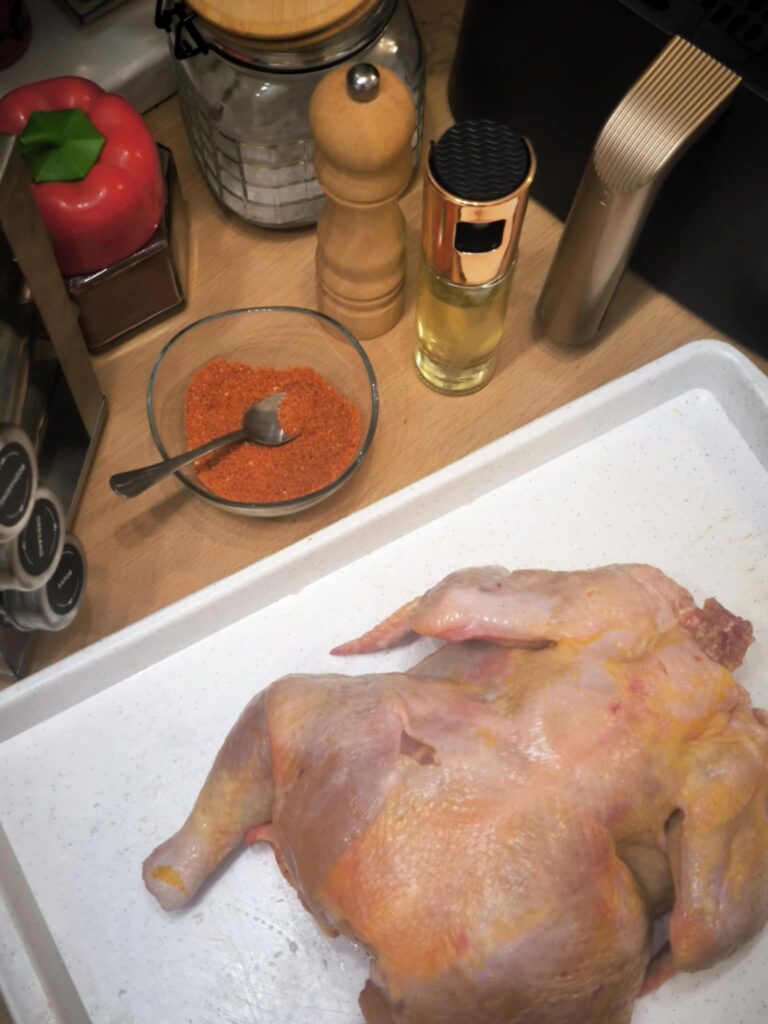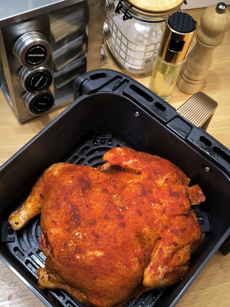 Bár kimaxoltam a rendelkezésre álló teret, de jelentem: siker! Ettől függetlenül maximum 1,8 – 2 kg súlyban lévő szárnyast javaslok hozzá, ami kényelmesebben süthető. Nem volt lehetőségem korábban befűszerezni, így egy klasszikus száraz pác készült: só, bors, füstölt fűszerpaprika, bbq grill fűszerkeverék. Pici olajjal körbekentem, alaposan bedörzsöltem mindenhol, majd az alsó kosárba helyeztem – egyúttal ki is próbálva az alul-felül sütés funkcióját is. #alulfelülsüt
