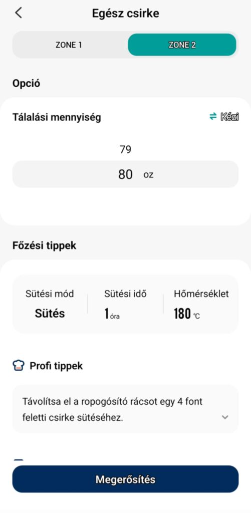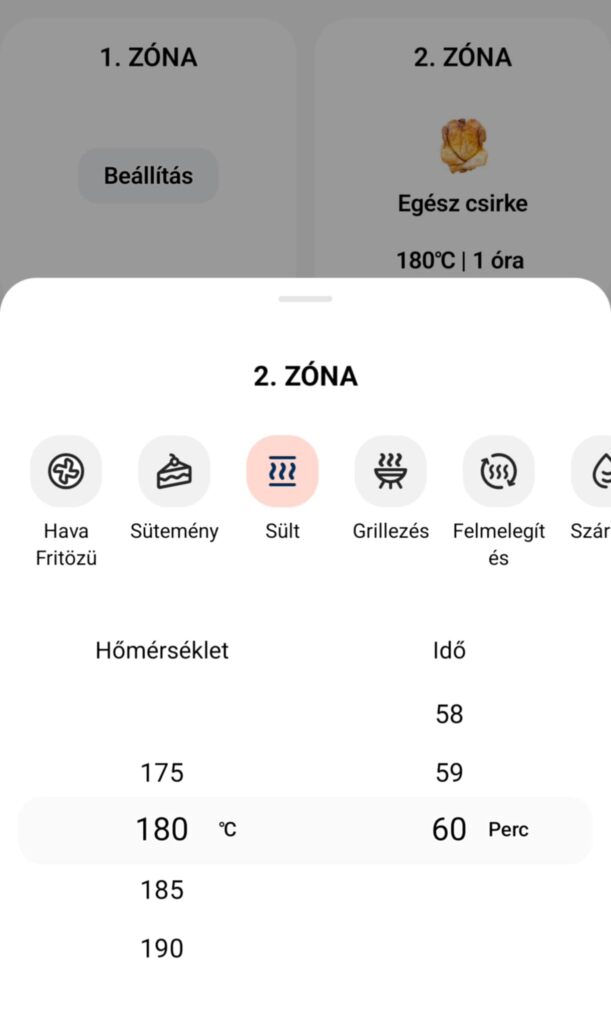 Próbaképpen 50 percre állítottam 175 fokon, de bevallom őszintén, nem bírtam ki, néha ránéztem, annyira izgatott voltam. A hozzá tartozó applikációval még ismerkedem, de az már első ránézésre egyértelmű, rengeteg finom opció közül válogathatunk! Bluetooth segítségével könnyű párosítani, amint kiválasztod a sütési módot rajta, a gép rögtön érzékeli is azt (idő, hőfok, alsó és felső kosárnál külön)! Az 50 perc elteltével értesítésem érkezett a mobilomra, elkészült ételem…