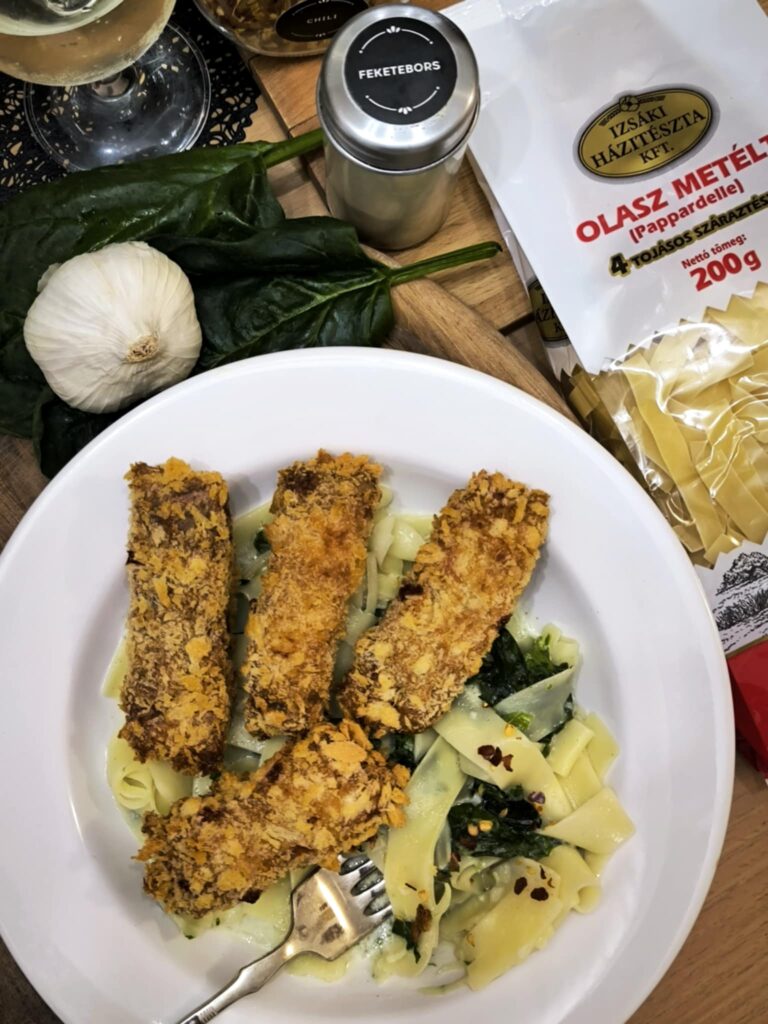 Pankómorzsában sült harcsafilé fokhagymás spenótos metélttel