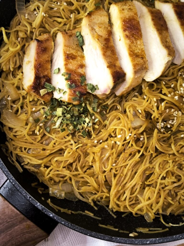 Egy mélyebb serpenyőn pár csepp olajon pirítsd le a vékony szeletekre szelt hagymát (lilahagymával még édesebb ízvilágot kapsz), szórj rá 3-4 evőkanál kristálycukrot, folyamatosan kevergesd, alacsony lángon, míg egy kellemes karamellizált alapot kapsz. Forgasd bele a főtt tésztát, locsold meg 2 evőkanál szójaszósszal. Két percig pirítsd tovább, míg összeérnek az ízek.