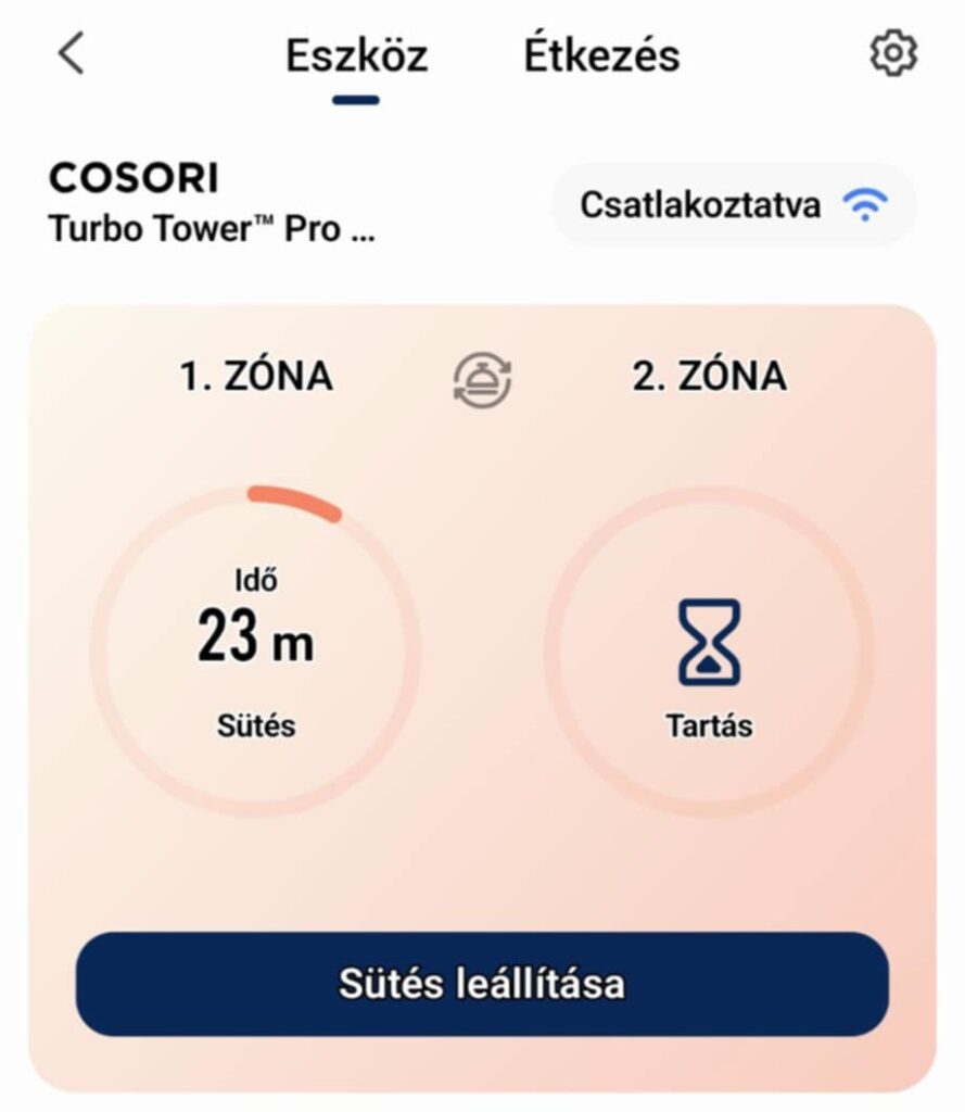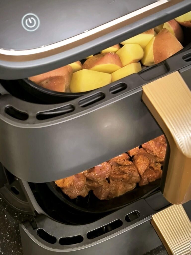 Tekintve, nálam egyszerre két kosárban süthető étel, melyet ráadásul szinkronizálni is lehet, hogy a krumpli és hús egyszerre készüljön el, én csak a legvégén forgatom össze a húst a krumplival.