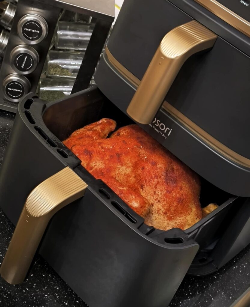Miután felavattam a gépet egy óvatos adag mirelit csirkemellel és steak burgonyával, jöhetett az igazi próbatétel: vajon elfér benne több, mint egy kiló egész csirke? Jelentem, igen! A kosár teljes kapacitását ugyan kimaxoltam az 1,3 kg csirkével, de ennél inkább kisebbet ajánlanék beletenni (egy kilogramm súlyig), hogy jobban tudjon keringeni benne a levegő. Az alsó kosár alsó-felső fűtőszállal rendelkezik, forgatni sem kellett, ami a hús méretéből adódóan különösen kedvező volt.