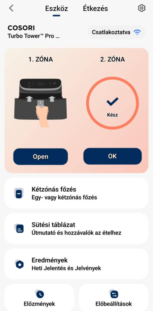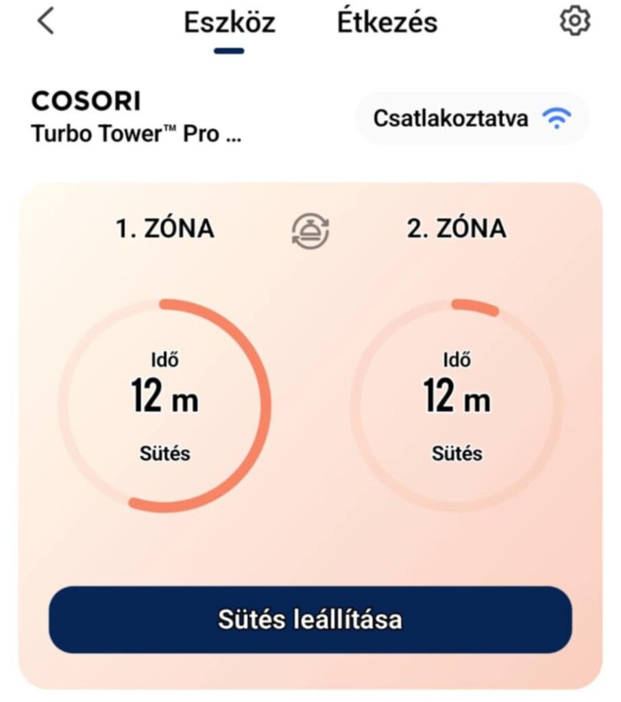 Ha letöltöd a VeSync alkalmazást hozzá, regisztrációt követően könnyedén párosítani tudod az eszközzel, így a másik szobában, mobilról is nyomon követheted, hány perc múlva lesz kész az ebéd. Ez különösen olvasás és sorozatnézés közben hasznos, nem kell a konyhában sürögni-forogni, ellenőrizgetni. Az applikációban számos recept közül is válogathatsz, összeírhatod sajátod, kezelheted a beállításokat. Biztonsági okokból telefonról nem lehet elindítani a forrólevegős sütőt.